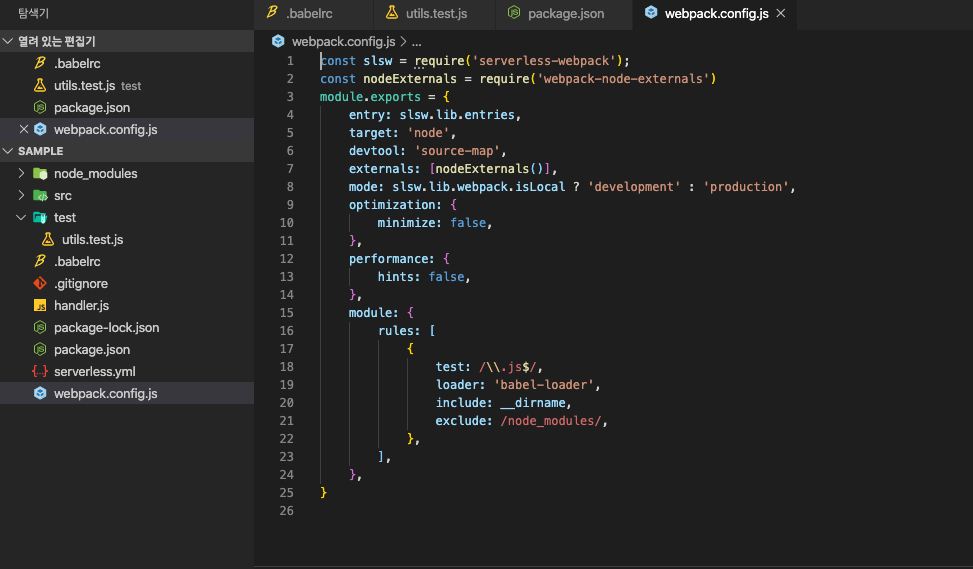 설치완료후 sample밑에 webpack.config.js 설정 파일을 만들어서 저장한다.