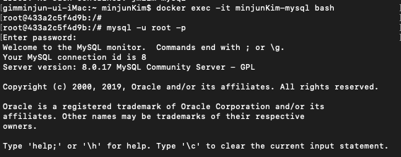 docker run -d -p 3306:3306 -e MYSQL_ROOT_PASSWORD=password --name minjunKim-mysql -v /Users/minjunKim/datadir:/var/lib/mysql mysql:8.0.17 --character-set-server=utf8mb4 --collation-server=utf8mb4_unicode_ci