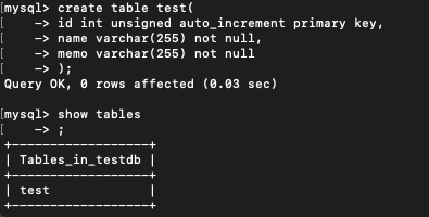 create table test( id int unsigned auto_increment comment 'ID (PK)' primary key, name varchar(255) not null comment '이름', memo varchar(255) not null comment '메모')comment 'test' collate=utf8mb4_unicode_ci;