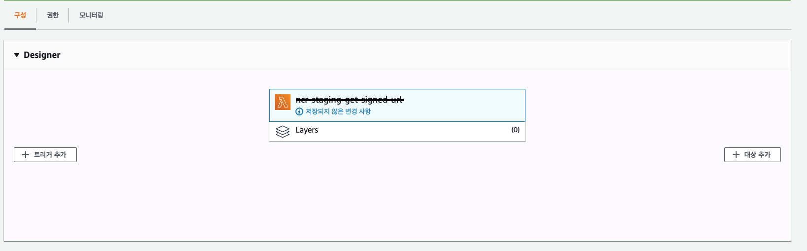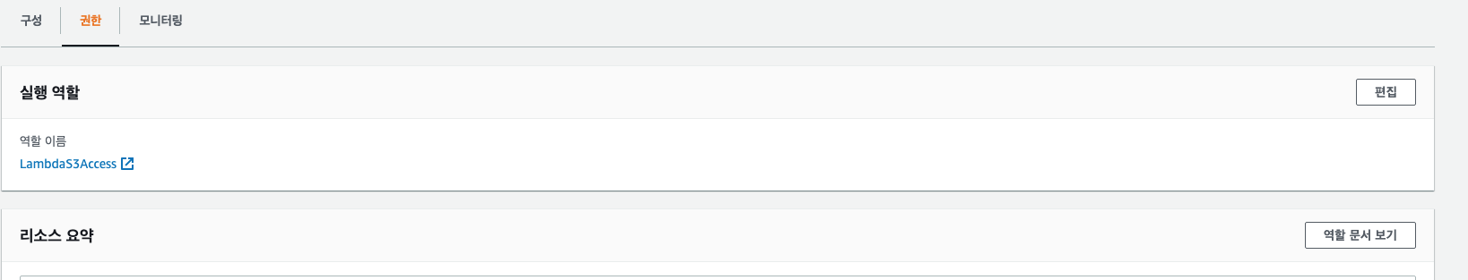 람다에서 보면 구성과 권한, 모니터링이 보이는데 우리가 필요한것은 권한 부분이다.