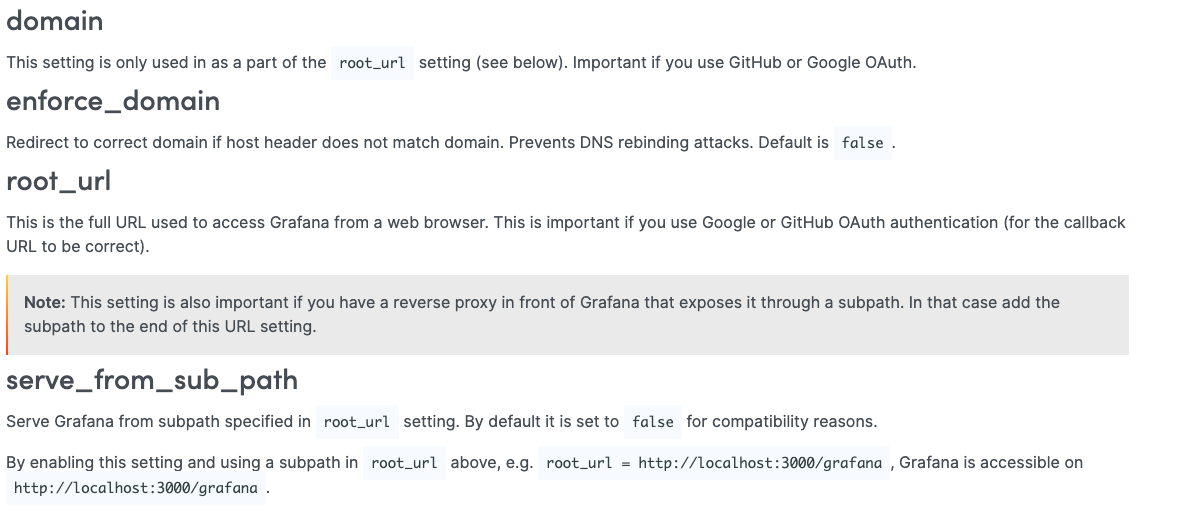 Grafana configuration을 보면 도메인에 연결하여서 접근하려면 ini을 설정해 줘야한다는 사실을 알수있다.